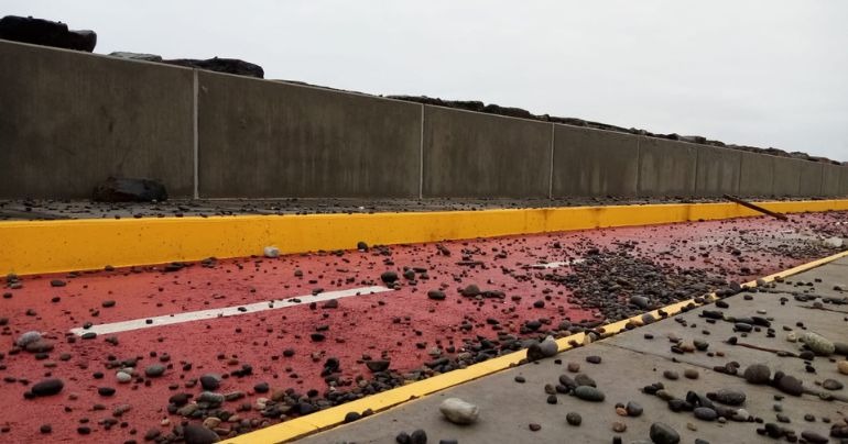 Un fuerte oleaje, registrado este domingo, provocó que piedras y otros objetos contundentes sean expulsados hacia la vereda, la ciclovía y un carril de la Costa Verde, en el Callao.
